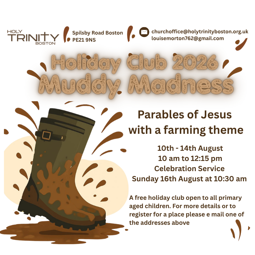 Muddy Madness. Parables of Jesus with a faming theme. Join us for our Holiday Club this year. All primary age children are welcome to our free Holiday Club.